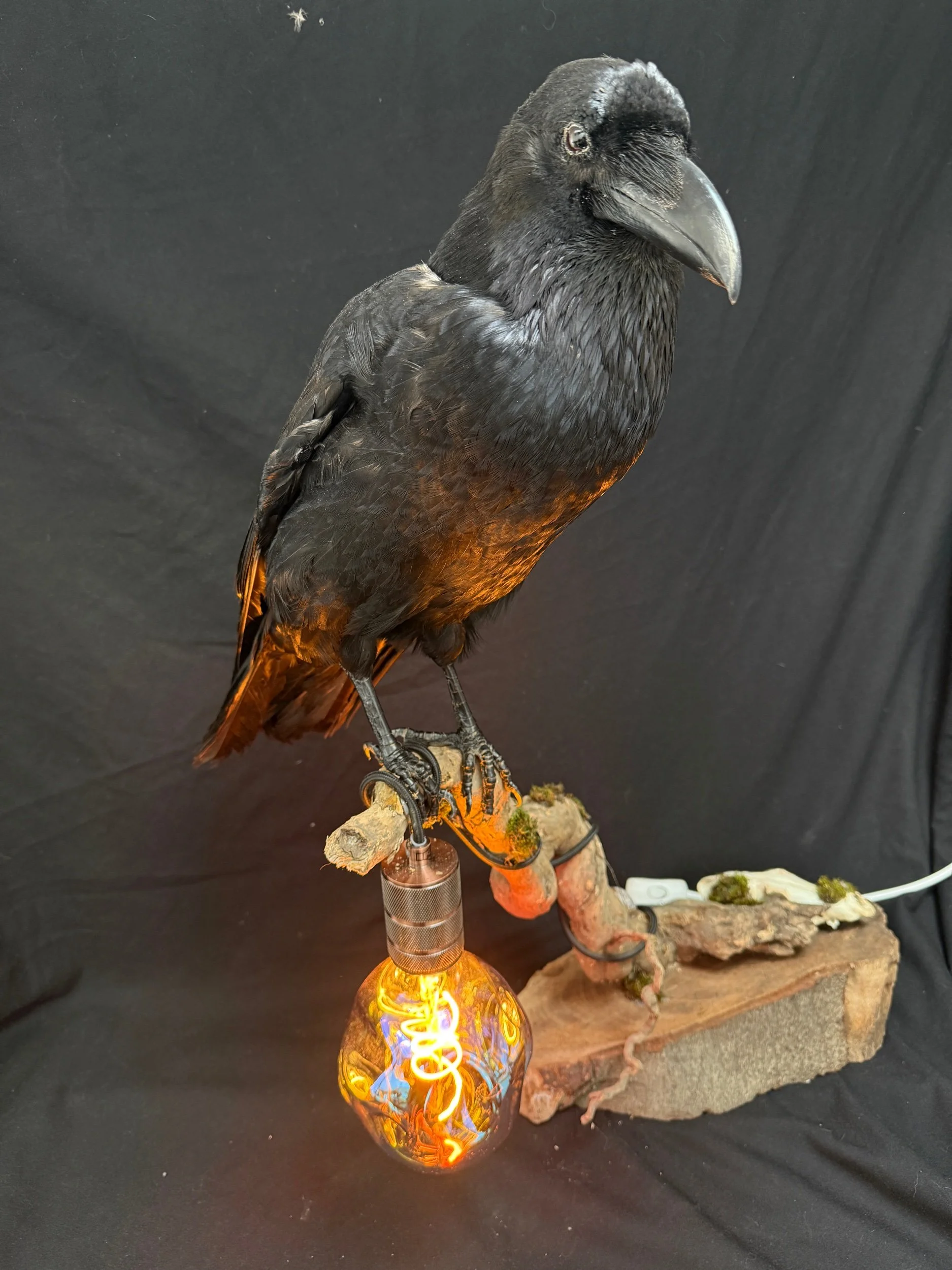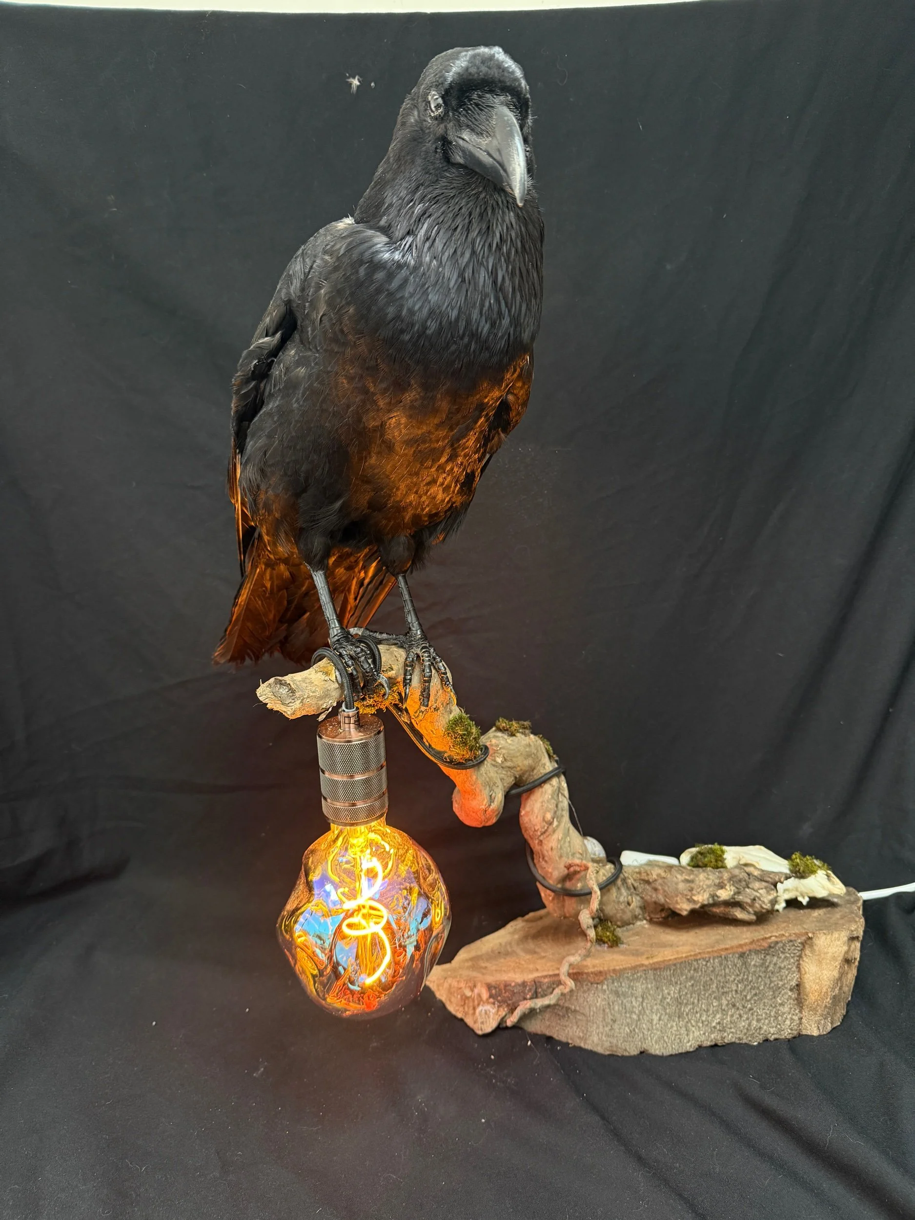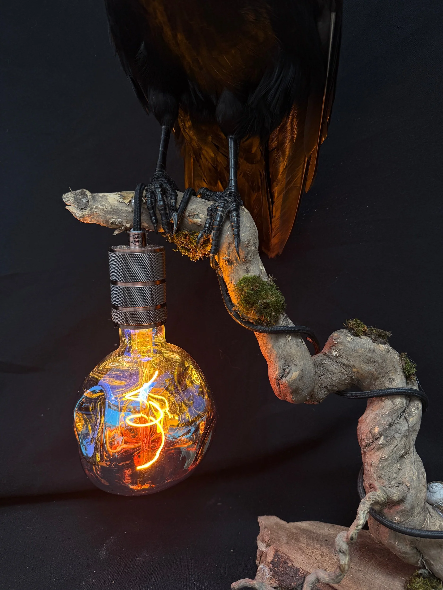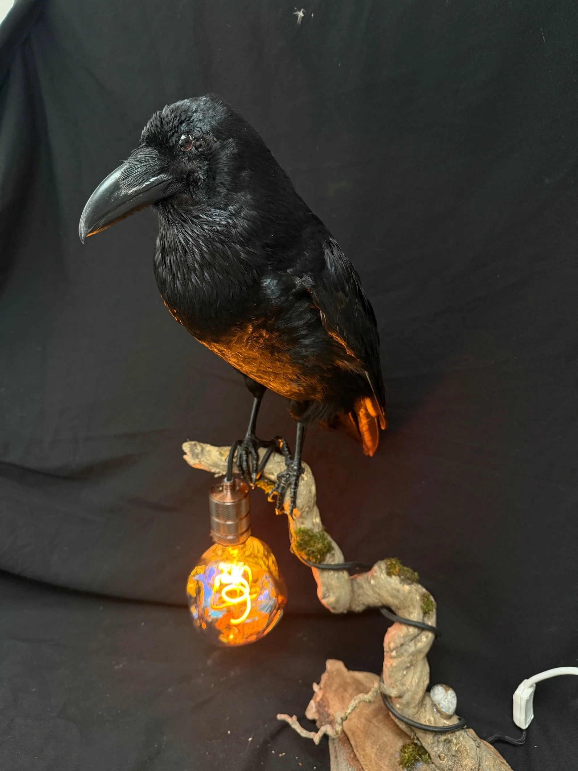Bring a bold, atmospheric statement into your space with this completely one-of-a-kind handcrafted raven lamp. Blending natural elements with warm ambient lighting, this piece sits at the intersection of gothic décor, taxidermy art, and functional design.