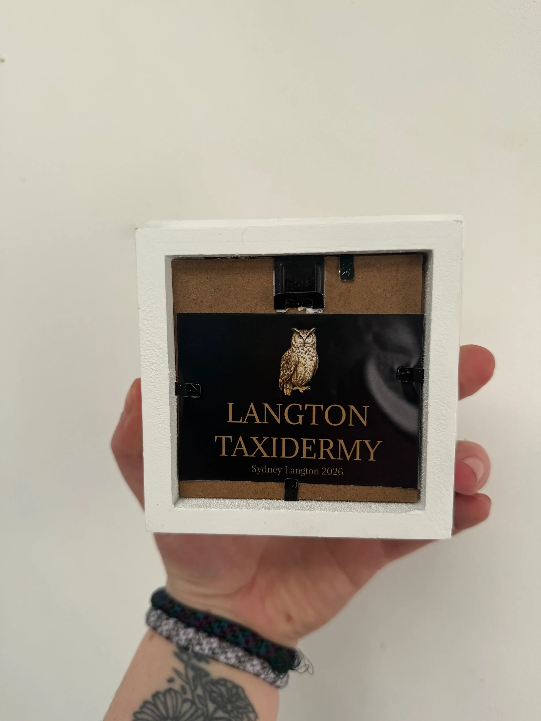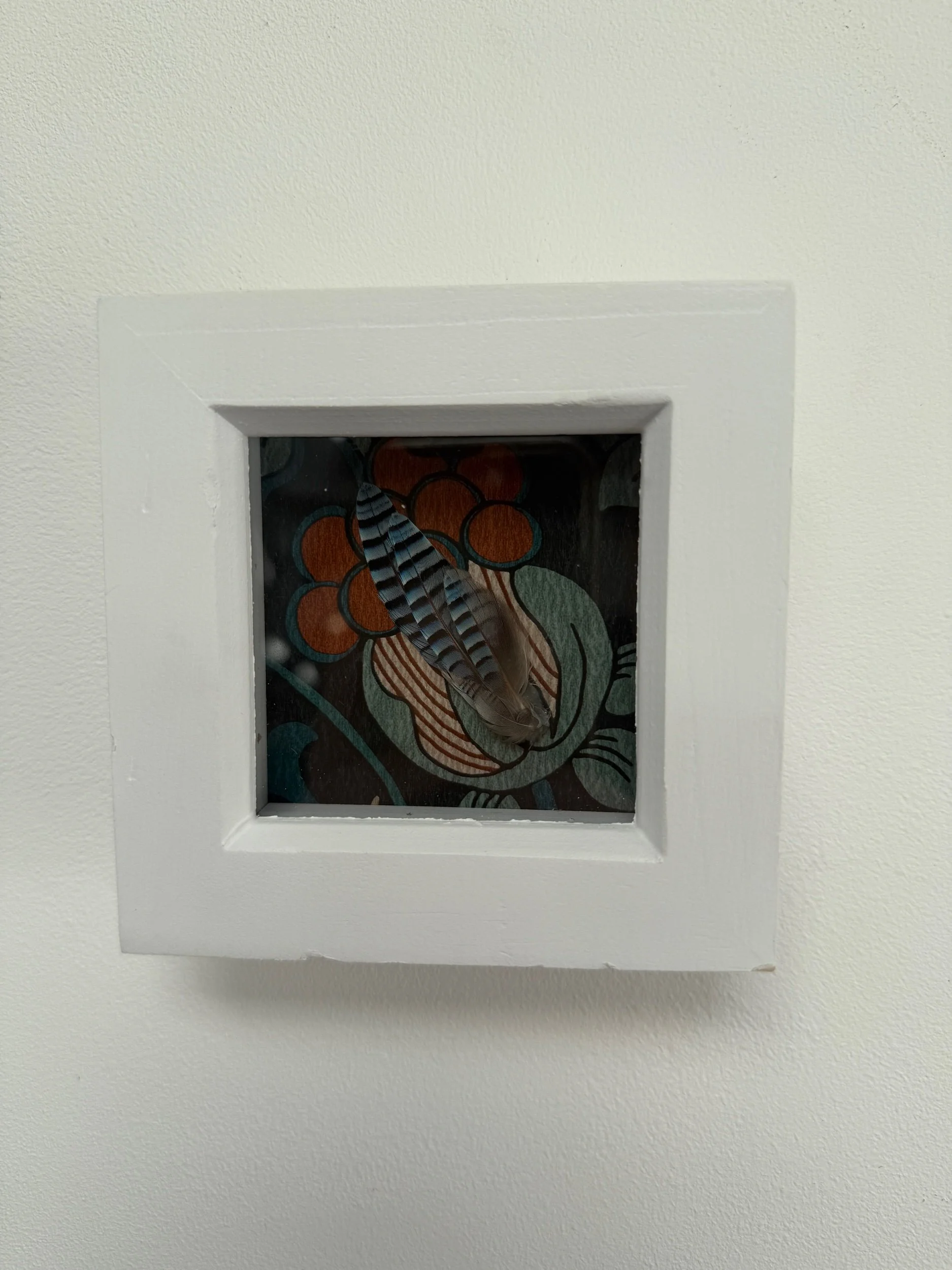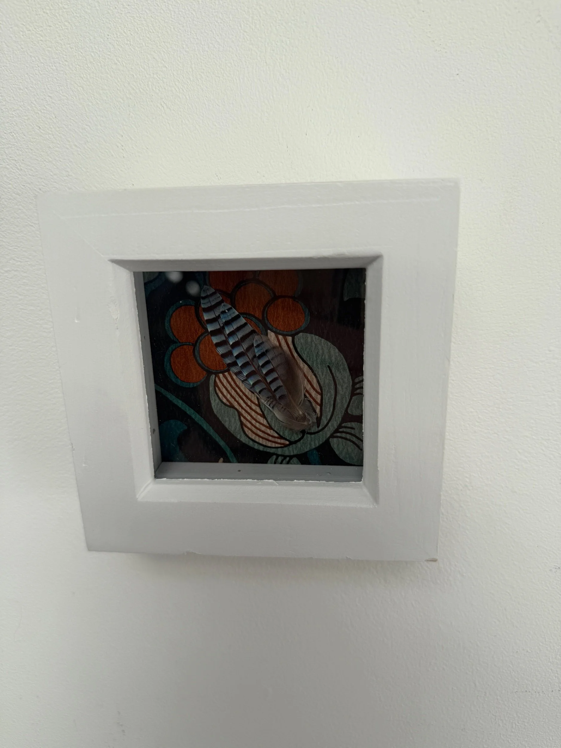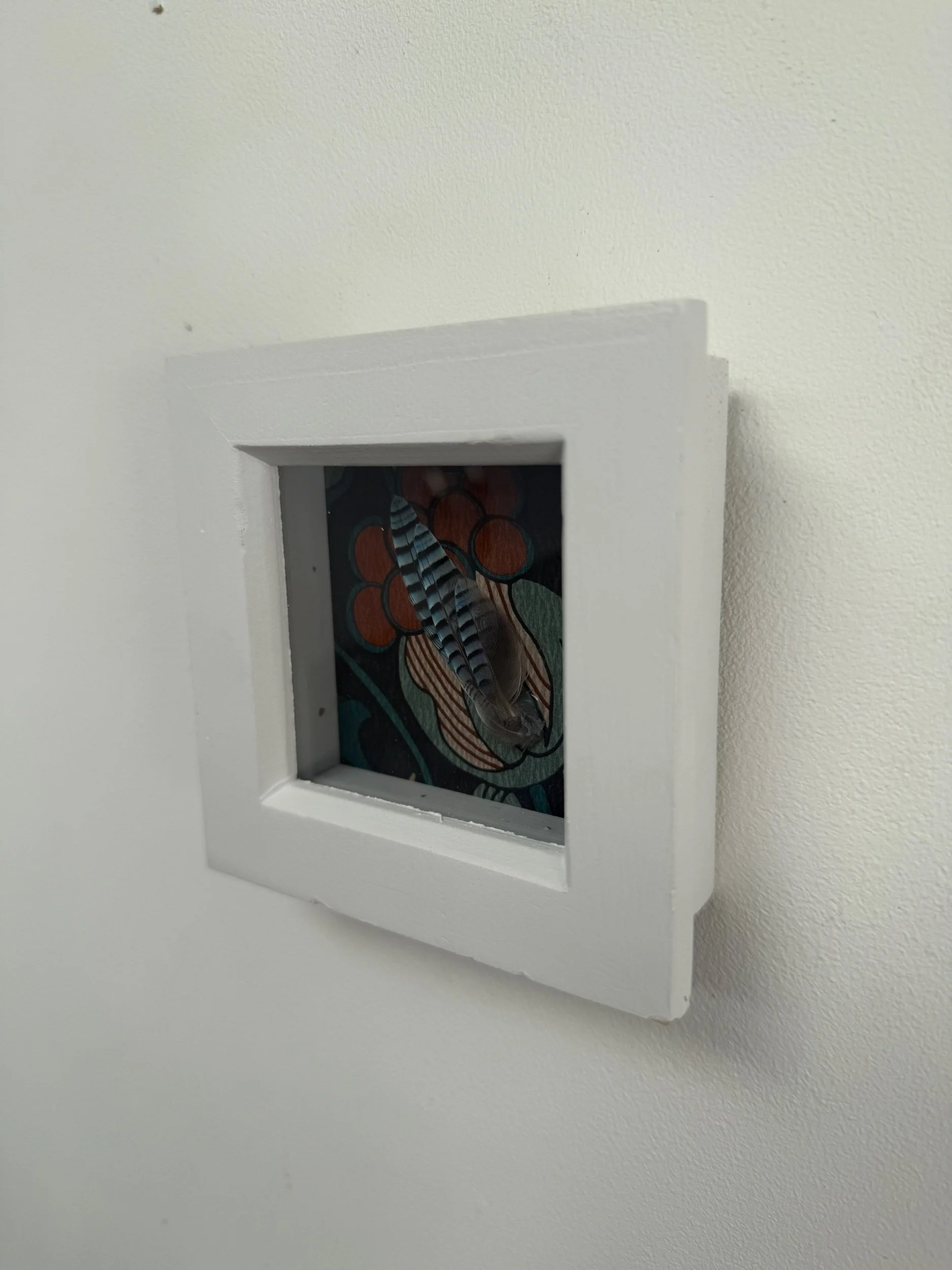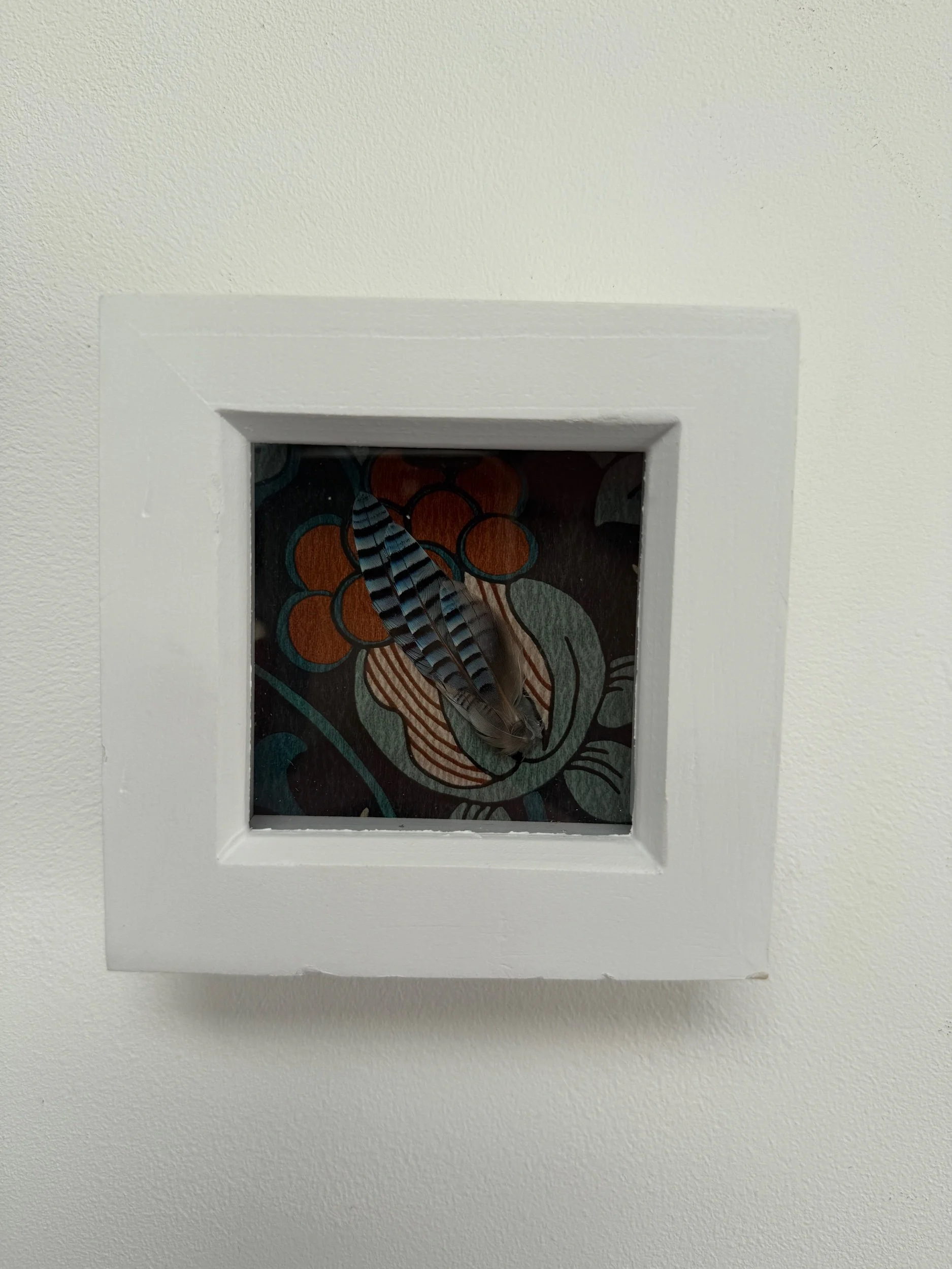 Small cluster of European jay feathers placed in a small white frame backed with wallpaper.