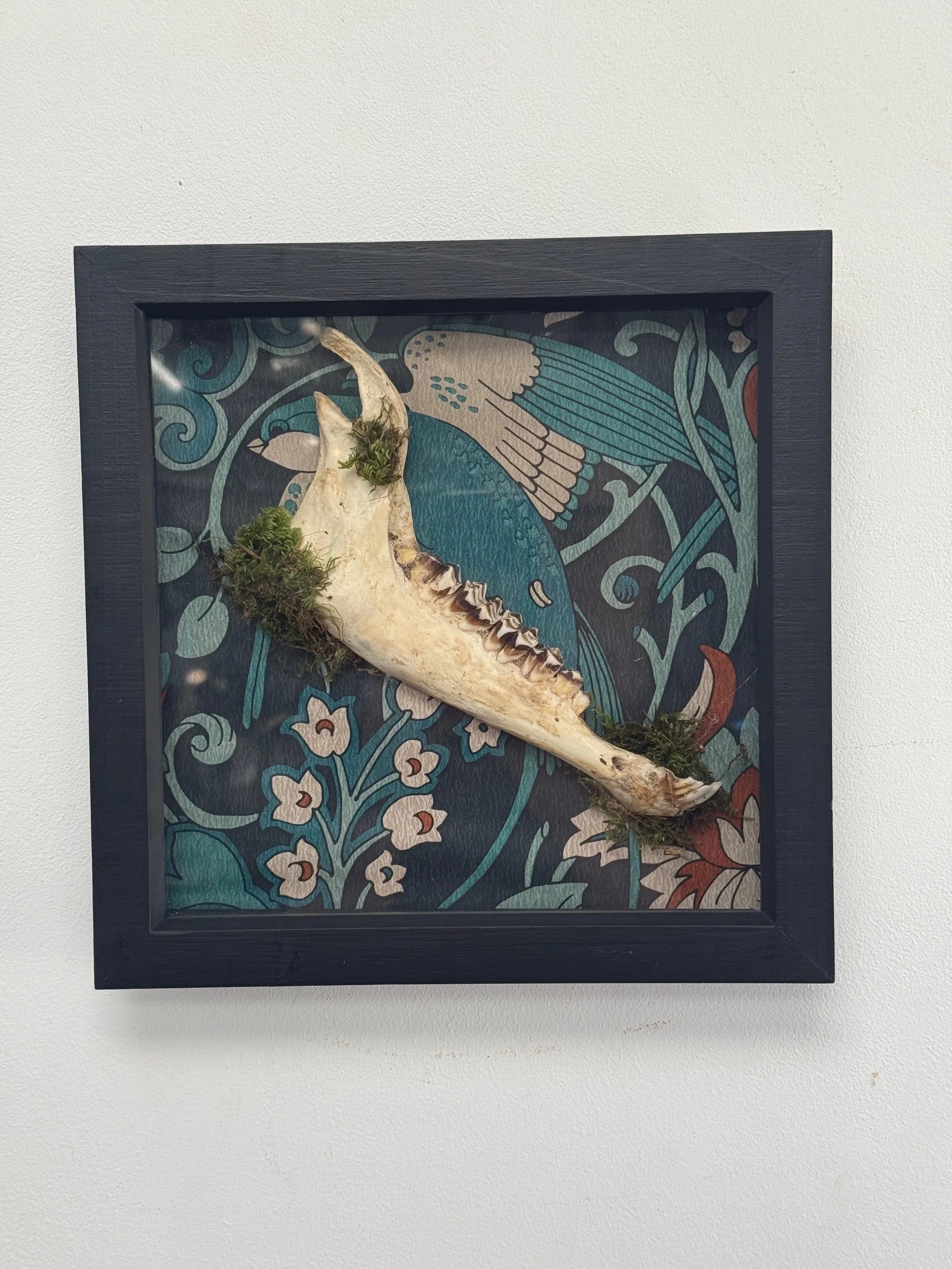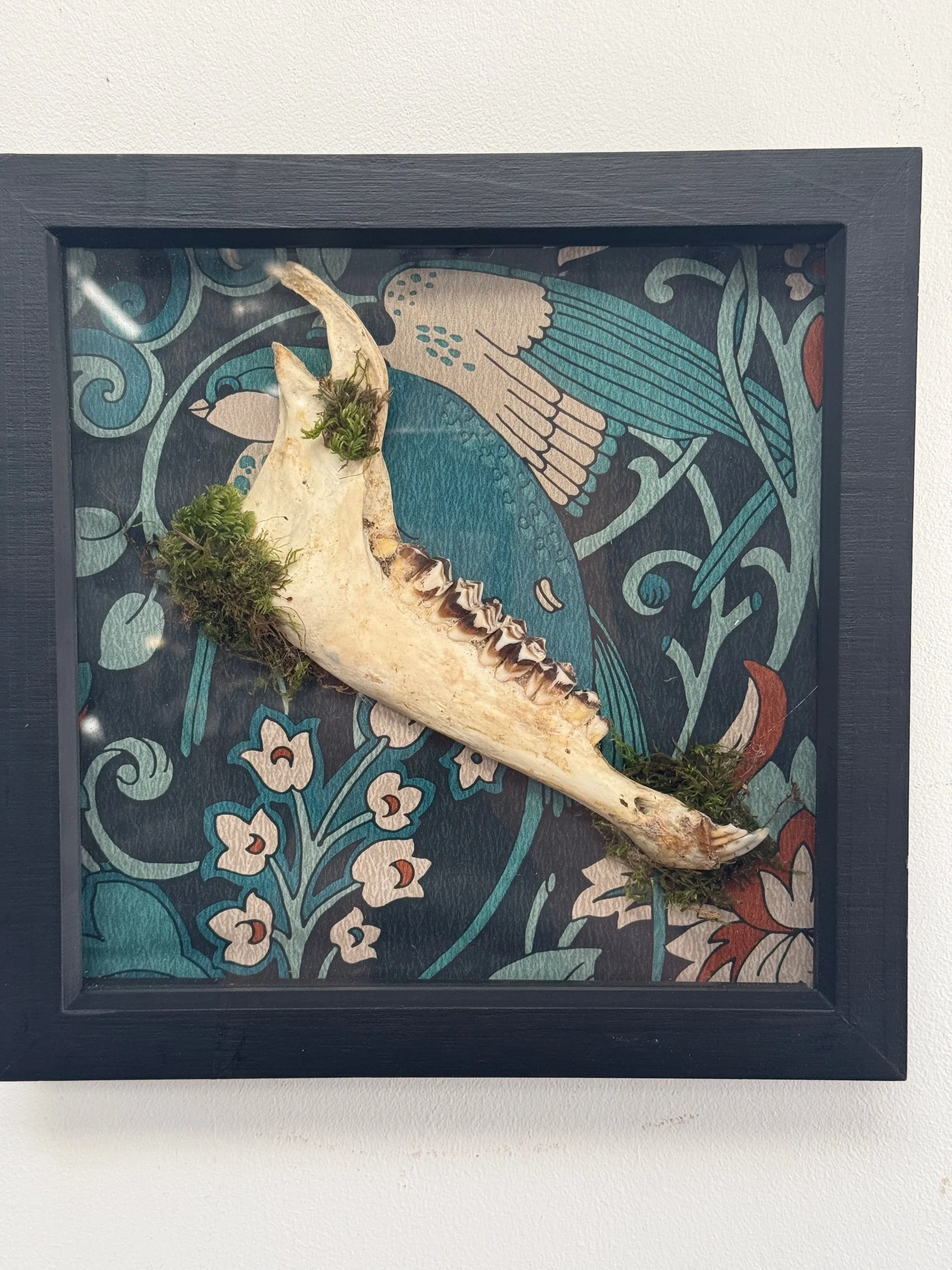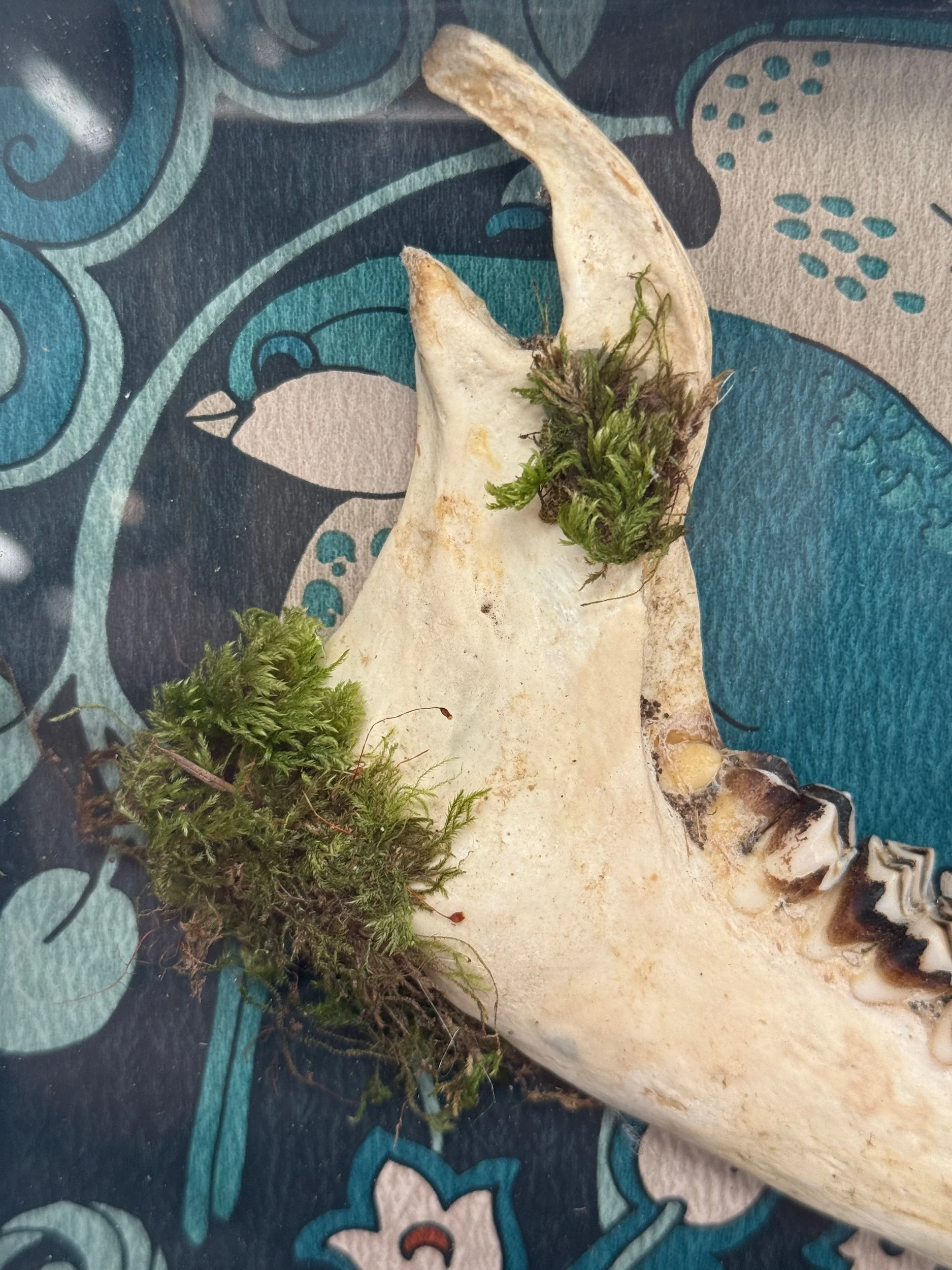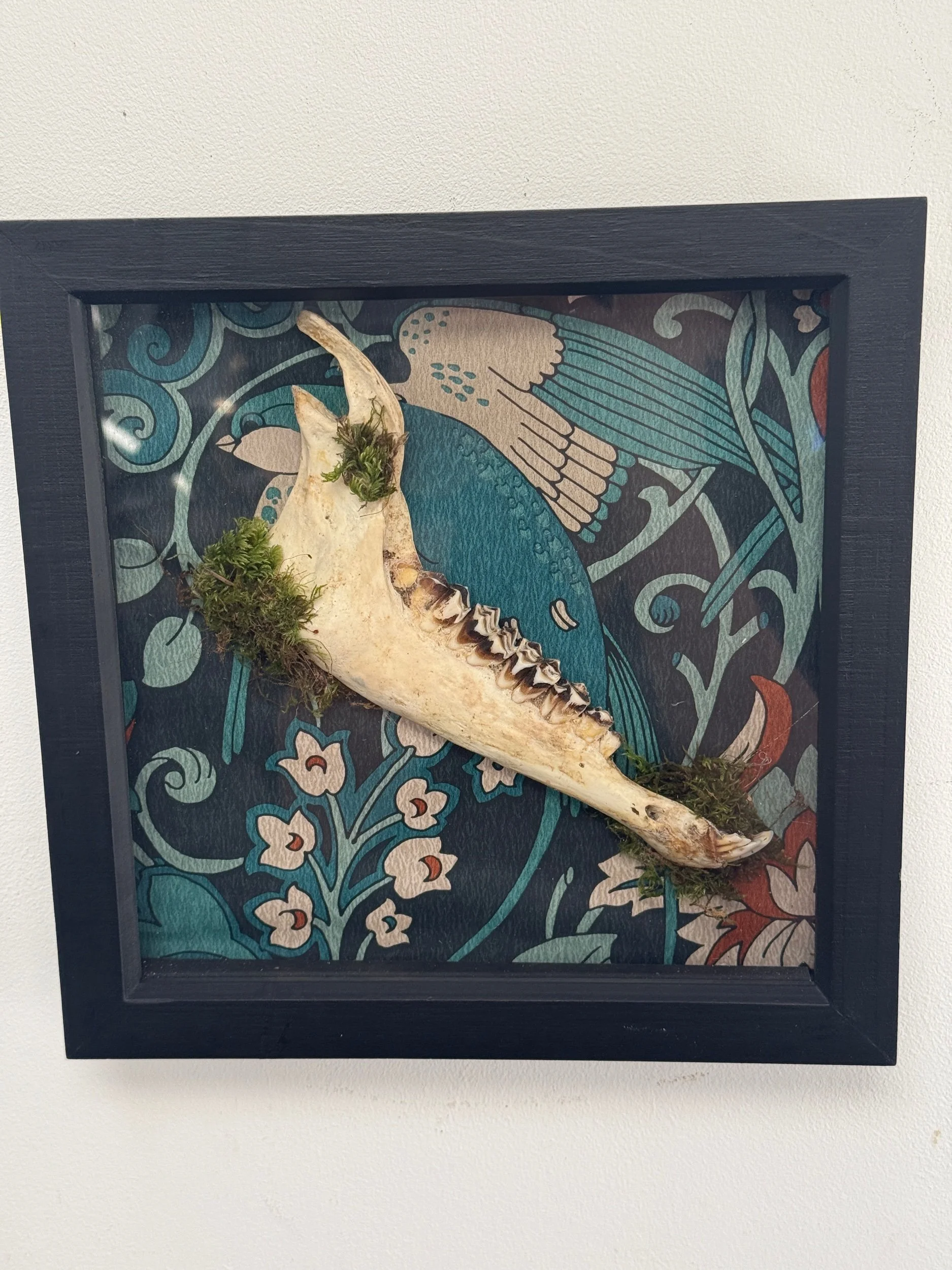 Rustic and naturally weathered Welsh sheep’s jaw jaw in a picture frame, backed with wallpaper and finished with moss accents.