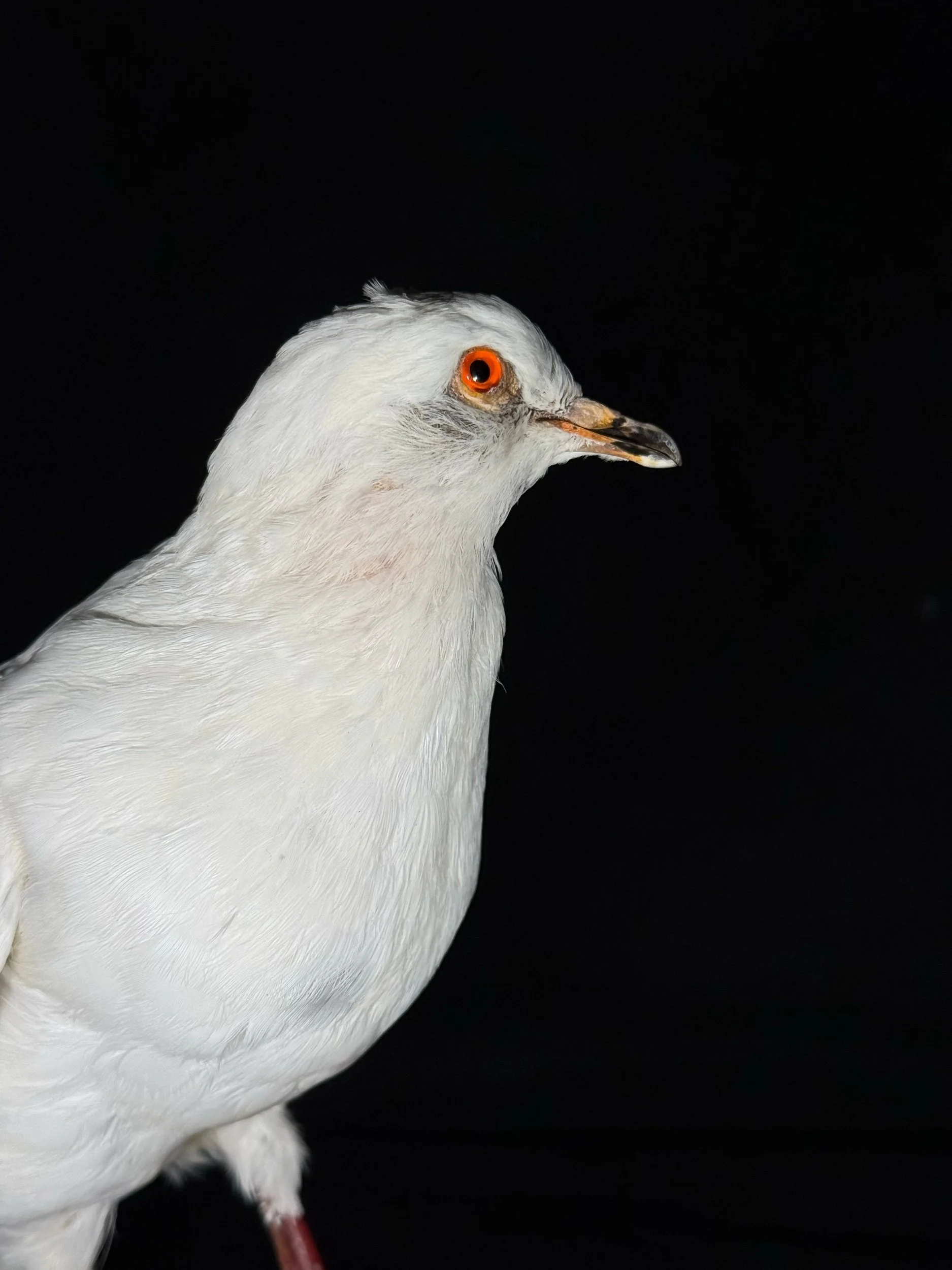 Very pretty white pigeon on a wooden stump giving it a rustic feel but still holding elegance to the piece.